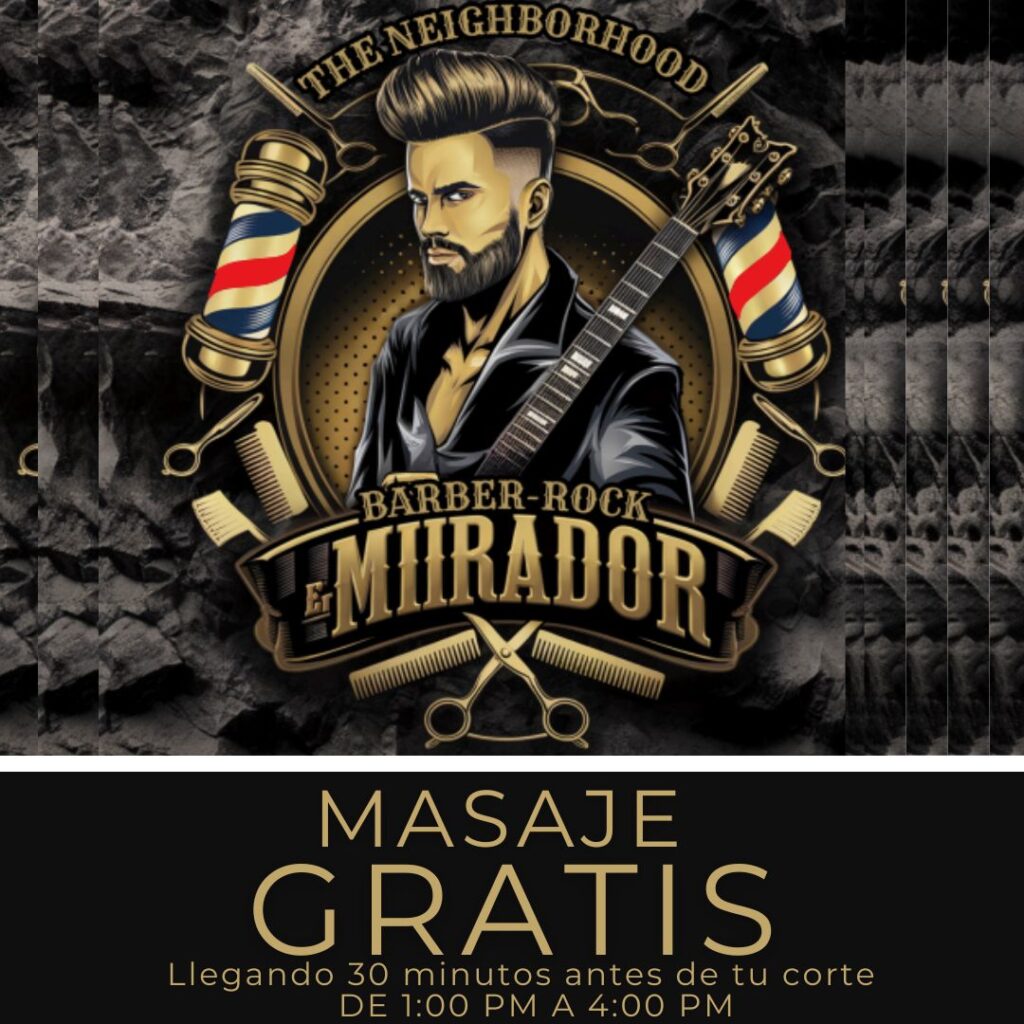 CORTE + MASAJE GRATIS (llegando 30 minutos antes de tu cita, solo aplica de 1PM a 4PM SOLICITA TU TARJETA DE LEALTAD CON TU NUMERO SAIPASS (5 CORTES Y EL 6 GRATIS) 25% de descuento en Masajes de Terapia Fisica, Masaje Descontracturante, Masaje Relajante y Descarga Muscular The Neighborhood Barber-Rock – Sucursal Mirador: Te saludamos de parte de The Neighborhood Barber-Rock, invitándote a consentir tu lado rockero 😎👊.